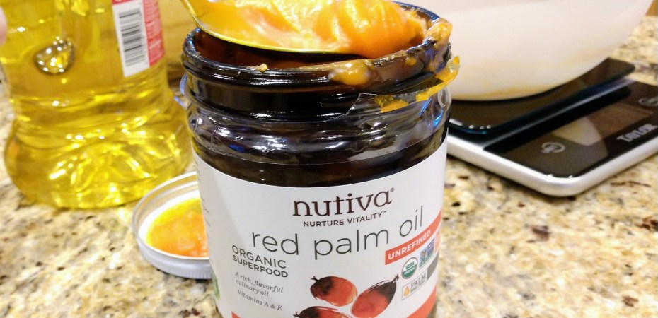 Continuing on my palm oil theme of the afternoon, we’re going to use red palm oil in this batch. This is the unrefined form of palm oil and it’s really more a carroty orange, which it gets from being loaded with carotenes. Red palm oil has the same saponification value (SAP value) as its bleached counterpart, so you put it in the lye calculator under plain ol’ “palm oil.”