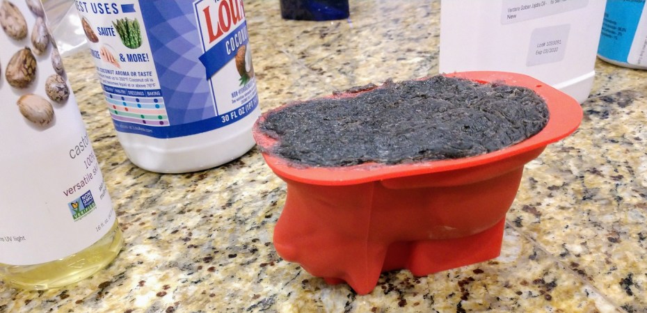 Check out the cool mold my mom sent me. They’re pretty hugenormous, about 345 grams, full, compared to a roughly hundred gram regular bar of soap. Today, I don’t have a ton of tallow hanging around. Whose house is this, anyway? Since I’m on a vegetable soap kick this weekend, I’m going to adapt the black walnut soap to an all vegetable, palm-free bar using coconut oil and olive oil. Probably, it’s going to be a pretty drying bar, but given that these black walnut soaps are for when you really want to scrub, it’s a good application for coconut.