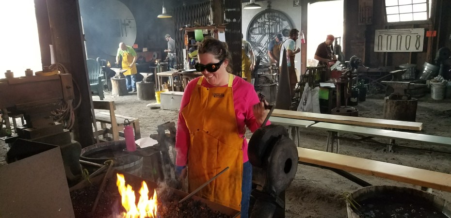 My classes involve working on a coal forge with a hand-turned blower. This is a fabulous thing for weird shaped pieces, big things that might not fit into a propane forge. This is something of a disaster for seeing the metal that’s heating, which is fairly critical for a total noob like me. My first day at class, I turned my pair of tongs into two sparklers, just like on the fourth of July. Steel burns, and as the carbon comes out in brilliant sparks, it is almost worth the failure, just for the fireworks.